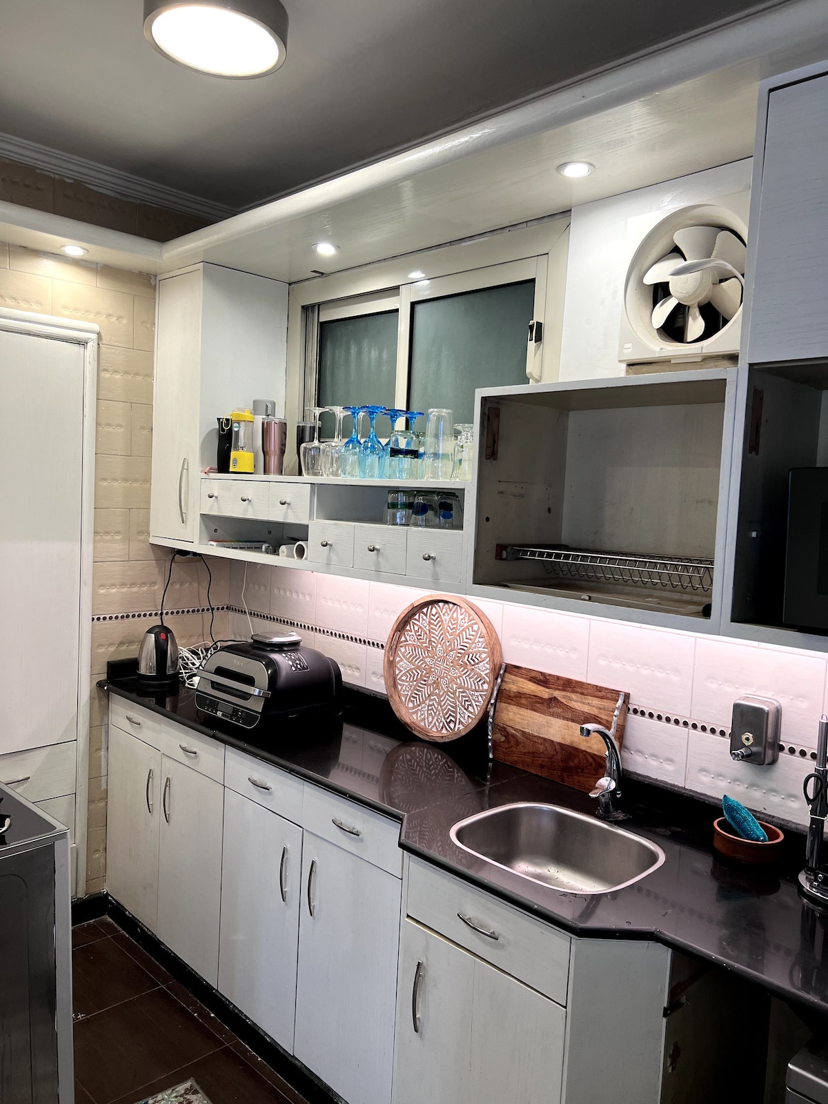 este un apartament cu 2 dormitoare, situat în centrul orașului Cairo, într-un cartier sigur. Ai toate magazinele și cumpărăturile în apropiere. Casa se simte confortabil ,cu 2 dormitoare, 3 paturi , saltea super confortabilă cu lenjerii de bumbac egiptean. 2 televizoare inteligente prin cablu Samsung de 50 inchi UHD+Netflix ..WiFi ...baie cu încălzire eficientă și mașină de spălat rufe. Bucătăria are toate facilitățile. Podea de lemn, cartier sigur. 3 aparate de aer condiționat, 2 încălzitoare. Spațiul de parcare este oriunde în jurul casei, la 13 minute de aeroport.