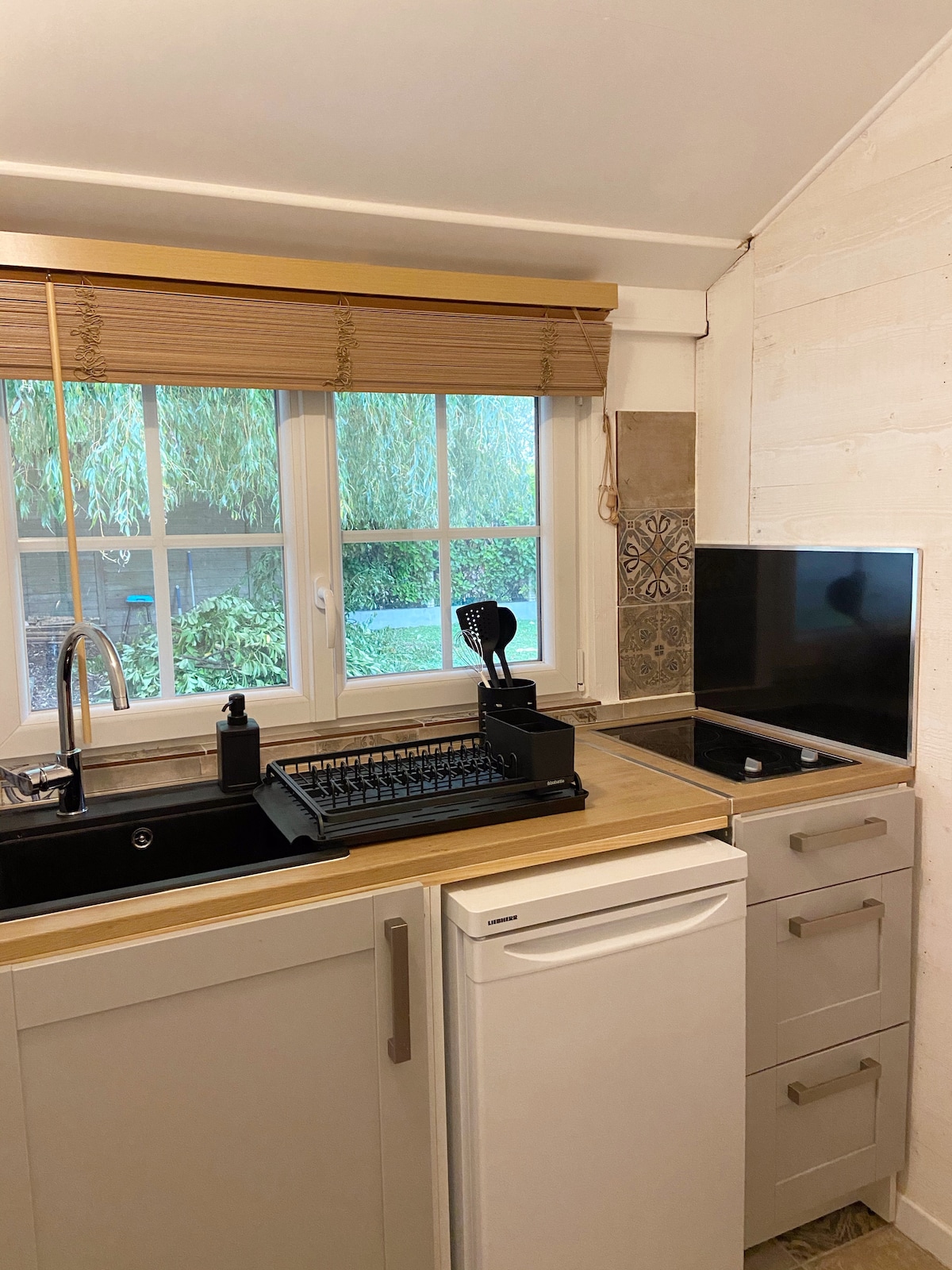 Casă separată de 30 m2 compusă dintr-un living cu bucătărie utilată, un dormitor cu un pat de 140 x 190 cm, o baie cu duș și o terasă. Situat ideal, la 7 minute de mers pe jos de Gare de la Frette Montigny - la 20 de minute de Paris Saint-Lazare cu trenul. Clădirea exterioară are o intrare privată, este situată pe terenul nostru aproape de casa noastră. Mediul este liniștit și verde. Acces la spălătoria noastră, dacă este necesar, pentru a spăla rufele, la cerere.