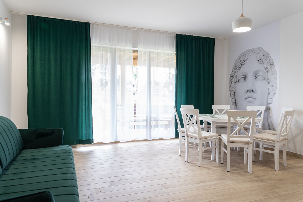 Răsfață-te cu odihnă și liniște! Oferim un apartament situat în Domysłów, lângă mare (4 km) și lacurile din apropiere. Un apartament cu 4 paturi, cu o suprafață de 38m2, format dintr-un living cu o chicinetă și o terasă. Livingul are două canapele extensibile. Anexa este dotată cu frigider, aragaz, cafetieră și articole necesare, cum ar fi farfurii, pahare, tacâmuri, oale, apă caldă etc. Baia este formată dintr-un duș,toaletă și chiuvetă.