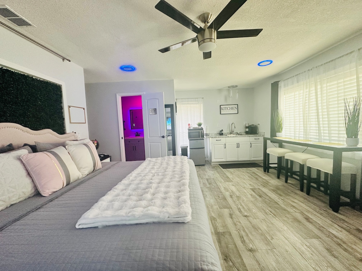 Simte-te ca acasă din momentul în care ajungi! Această suită studio privată confortabilă și spațioasă este perfectă pentru relaxare, lucru sau explorarea zonei. Cu un aspect deschis și fără pereți interiori, oferă un spațiu confortabil și funcțional cu: Pat matrimonial „Queen” Canapea extensibilă Zonă de luat masa pentru două persoane Bucătărie mică Wi-Fi de încredere gratuit Bucură-te de aer liber pe terasa privată. Locație excelentă: la câteva minute de restaurante, magazine și plaje frumoase. La doar 50 de minute de Aeroportul Internațional Tampa.