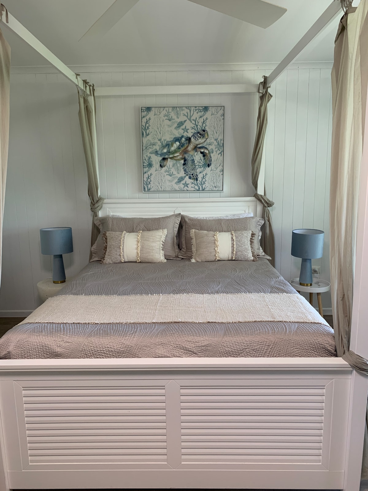 Perfect pentru familii sau grupuri — mai multe cabine disponibile! Acest studio renovat oferă o evadare liniștită pe malul lacului, cu o bucătărie nouă, mașină de spălat rufe și uscător. Bucură-te de mobilier modern, aer condiționat, ventilator de tavan, smart TV și pat matrimonial cu baldachin. Relaxează-te pe verandă și urmărește țestoasele din lac. La doar 300 m de plaja Urangan și la o scurtă plimbare de magazine și cafenele, cu o locație perfectă pentru toate transferurile K'gari.
