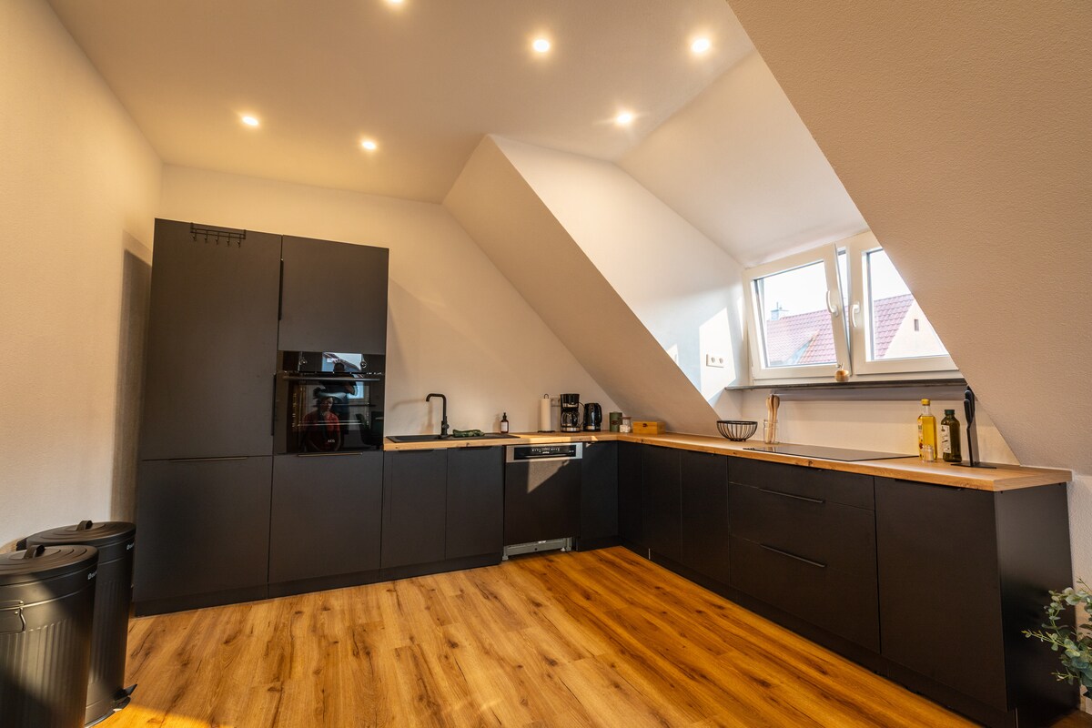 Apartament la subsol nou construit lângă gară și castel. O bucătărie complet utilată cu aragaz, frigider-congelator, mașină de spălat vase, cafetieră și prăjitor de pâine îți oferă toată libertatea de care ai nevoie pentru serile culinare în zona de luat masa sau pe terasa mare cu grătar pe gaz. Noua canapea extensibilă este echipată cu o saltea completă. SmartTV cu Prime, Disney, rtl+ și Alexa însoțesc relaxarea. În baie există un duș cu efect de ploaie, un pisoar și o mașină de spălat cu uscător.