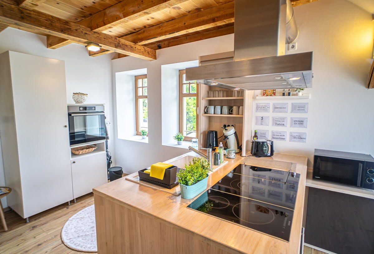 În mijlocul unei ferme cu farmec pitoresc, vei găsi suficient spațiu și pace într-un studio mare, ca un loft, pentru a te opri netulburat și relaxat, pentru a face planuri noi sau pentru a te întâlni cu prietenii. De aici poți vizita obiectivele turistice din Ținutul Wettiner din apropiere, poți înota în Seekreis sau poți descoperi magia morainei terminalului pe marile trasee de drumeții.