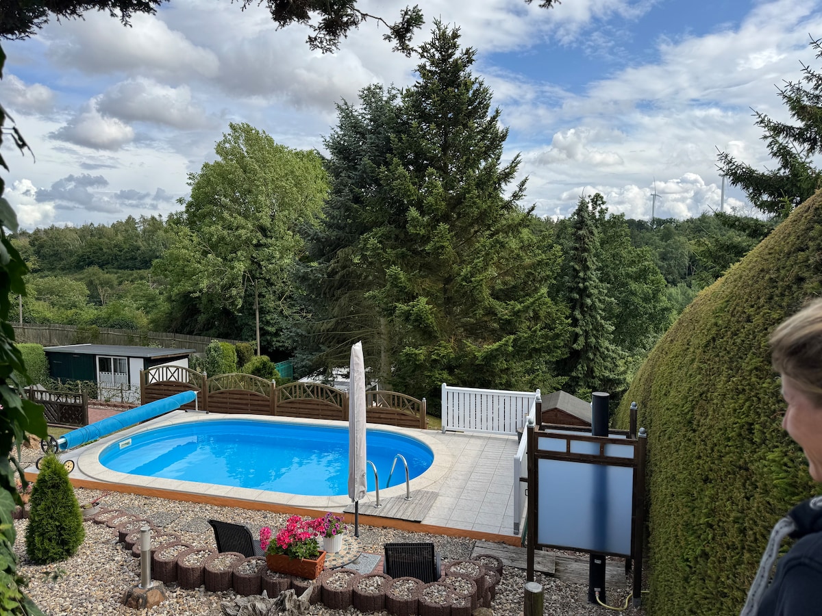 Bungalow idilic în Wippra, poartă de acces la Harz, înconjurat de natură. Bucură-te de terasa spațioasă din piatră naturală, bucătăria modernă, un living confortabil cu TV UHD și șemineu și o baie elegantă. Două locuri de parcare și biciclete sunt, de asemenea, disponibile în funcție de aranjament. Descoperă pârtia de săniuș de vară din apropiere cu pădure de alpinism, vara piscina în aer liber și barajul cu trasee unice de drumeții. Perfect pentru recreere și aventuri în natură. O trambulină este, de asemenea, disponibilă pentru copii.