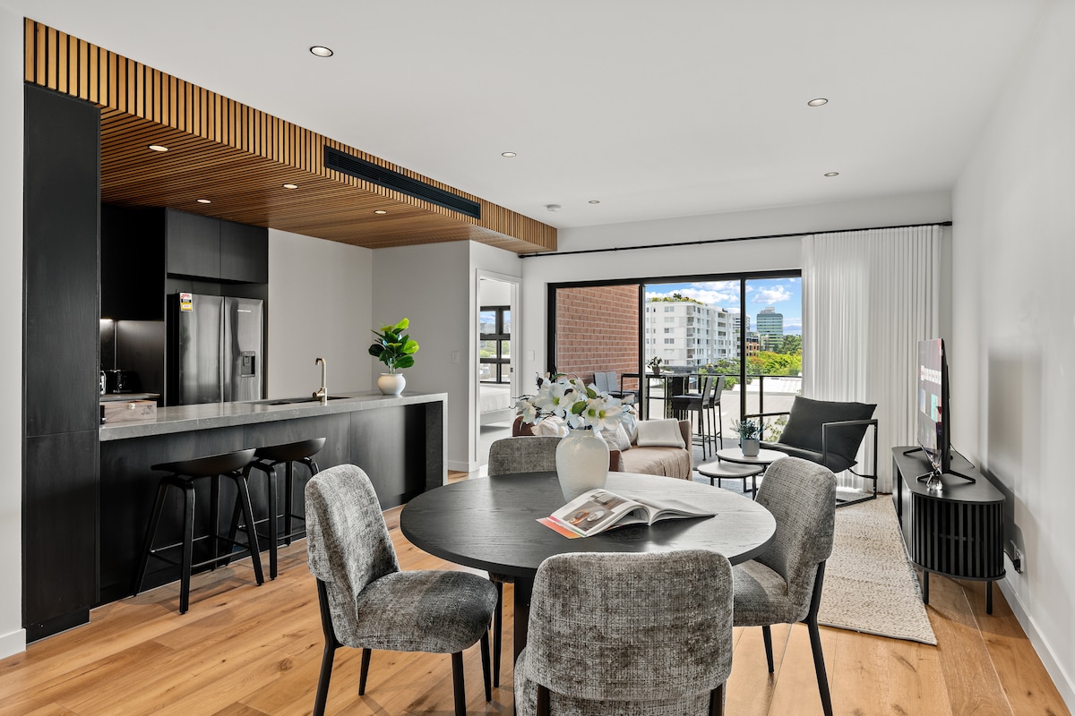 Bine ai venit în oaza ta urbană! Acest studio are o terasă privată cu grădină pe acoperiș, cu vedere la hinterland. Bucură-te de designul în plan deschis cu ferestre din podea până în tavan, o chicinetă, sufragerie, lounge și dormitor. Perfect pentru muncă sau relaxare, yoga sau adunări mici. Are o masă de studiu și o masă de sufragerie mare. Locație ideală pentru Southbank, The Gabba, QPAC, Riverstage, Suncorp Stadium și Centrul de Convenții. Include un televizor inteligent de 55"+ Netflix gratuit și parcare gratuită. Un refugiu perfect în oraș!