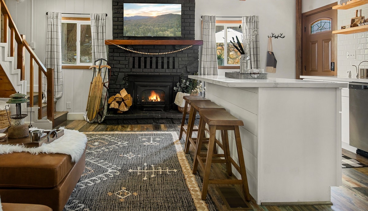 Welcome to The Den, designed by LBL Design Co. Our cozy cabin from the 1960s has been fully renovated creating a romantic moody retreat. Features a fresh look with almond blasted ceilings that is woodsy yet modern, along with a private hot tub. Centrally located to everything you’ll want to explore in the San Bernardino Mountains. Gather on our deck for beers and conversation. Roast gooey s’mores beneath a sky of stars. And curl up on our velvet sofa as the fireplace glows before you.