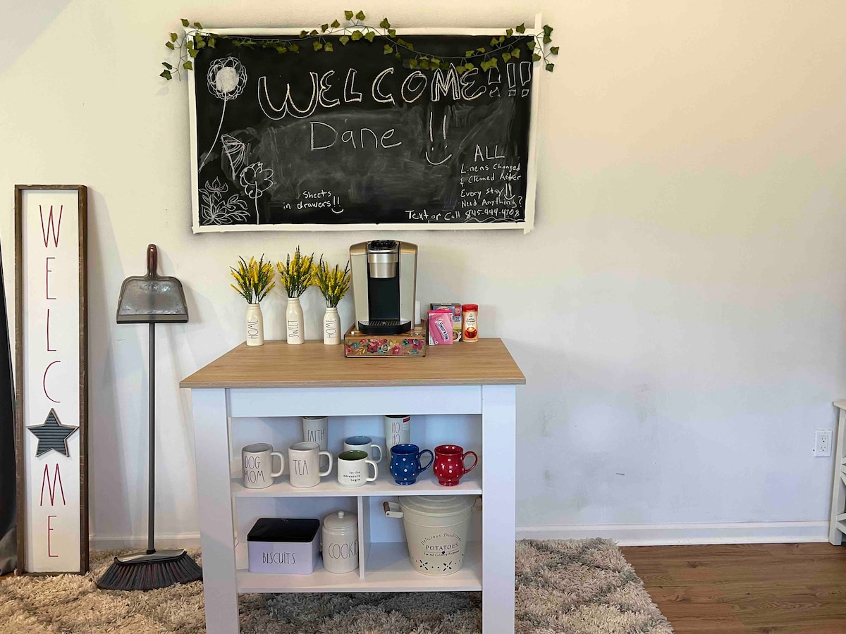 Apartament eficient recent renovat. Bucătărie completă, electrocasnice noi. Spațiu confortabil cu pat matrimonial și duș în baie. Plimbare scurtă până la cafenea și tot Cornwall-ul! 3 mile până la West Point. Zece minute de mers cu mașina de Storm King, Dia în Beacon, restaurante pe râul Hudson. O MULȚIME de opțiuni de drumeții, trasee de vin și explorarea văii Hudson. Woodbury Commons este la 10 mile pentru cei care preferă cumpărăturile! Te ajutăm cu plăcere cu rezervări la cină și te ajutăm să îți faci șederea memorabilă! Prietenos cu animalele de companie.