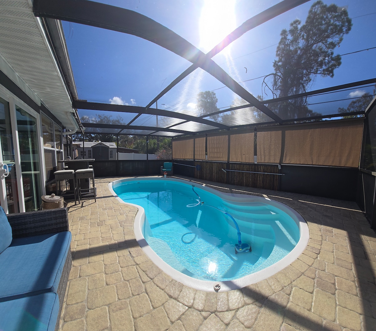 Casă confortabilă, spațioasă, 🏡 cu 🏊♀️ piscină încălzită, lângă un teren de ⛳️ golf. Aproape de faimoasele plaje⛱️, St.Pete și Tâmpa. Această casă confortabilă și deschisă are un living mare, o bucătărie mare și o terasă cu piscină. Toate cele 3 dormitoare au televizoare mari. Terasa mare din spate are o 🏊♀️ piscină, TV, frigider și grătar pentru gătit și R&R. Situat într-un cartier liniștit, potrivit pentru familii. Poziție! 15 minute - Clearwater Beach, Dunedin, Safety Harbor 30 de minute de - St.Pete, Aeroportul TPA, Tampa