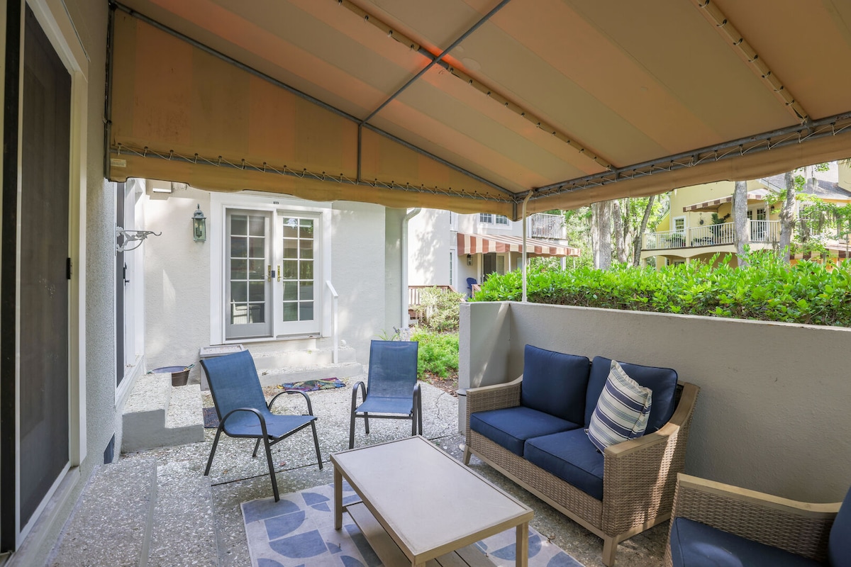 5-10 minute walk to the pristine Hilton Head beach, retreat to your spacious villa in Queen's Grant of Palmetto Dunes. With nearly 1500sq ft and lofted ceilings, you can spread out comfortably. New living room furniture that all reclines, amazing king green tea memory foam mattress in both bedrooms, and a fully stocked kitchen (blender, toaster oven, crock pot+.) The master and living room open up to a private back patio equipped with a grill, dining room table and beach accessories.