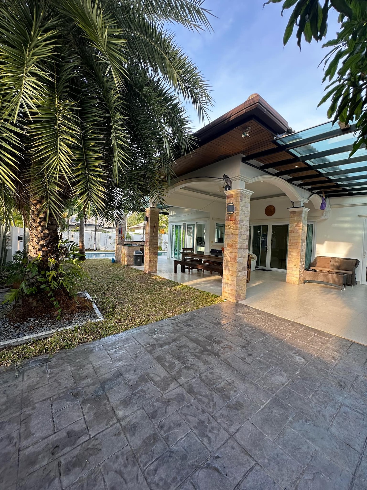 Frumoasă vilă cu 2 dormitoare și 2 băi, 1 dormitor este en-ensuite. Bucătărie europeană complet utilată, cu insulă de bucătărie și masă, livingul are un grup de scaune, TV inteligent de 55", Wi-Fi de cea mai mare viteză și cutie TV de la 3BB, toate camerele au aer condiționat, scaune exterioare și zonă de luat masa, fiecare cu ventilator de acoperiș, șezlonguri, piscină cu apă sărată de 10 x 3,5 metri și o grădină frumoasă, duș exterior, mașină de spălat rufe și port auto pentru 1 mașină.