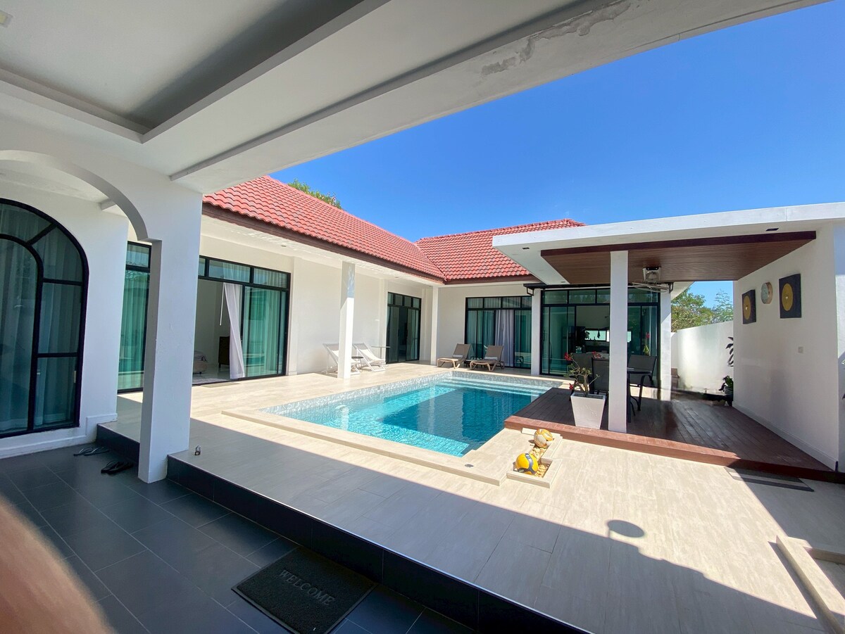 Beautiful 2 bedroom and 2 bathroom villa, 1 bedroom is en-ensuite. Fully equipped European kitchen with kitchen island and dining table, the living room has seating group, 55" smart TV, highest speed wifi, and TV box from 3BB, all rooms have air-conditioning, outside seating, and dining area, each with a roof fan, sunbeds, 10 x 3,5-meter saltwater pool, and a nice garden, outside shower, washing machine and carport for 1 car.