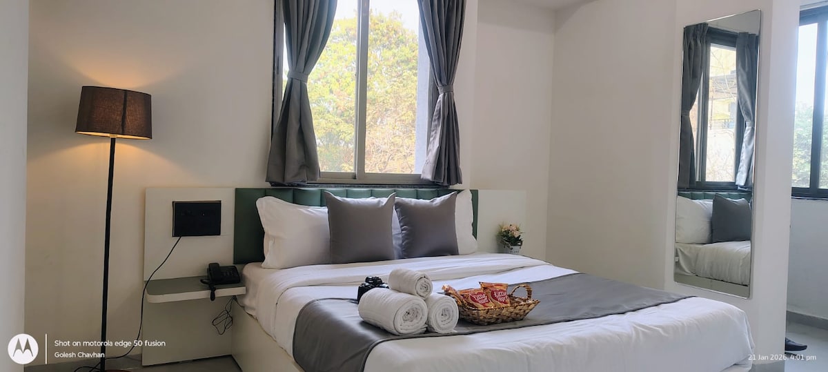 Its A four story Building, where you will get a hotel room with a great stylish stay, A nice cozy stay and a best ambience to relax and focus on Important things and breathe in a calm environment. You get the centre of the location with lots of shopping and coffee places here. Also roads connected to the main places of Pune You’ll love the stylish decor of this charming place to stay. Enjoy easy access to popular shops and restaurants from this charming place to stay.