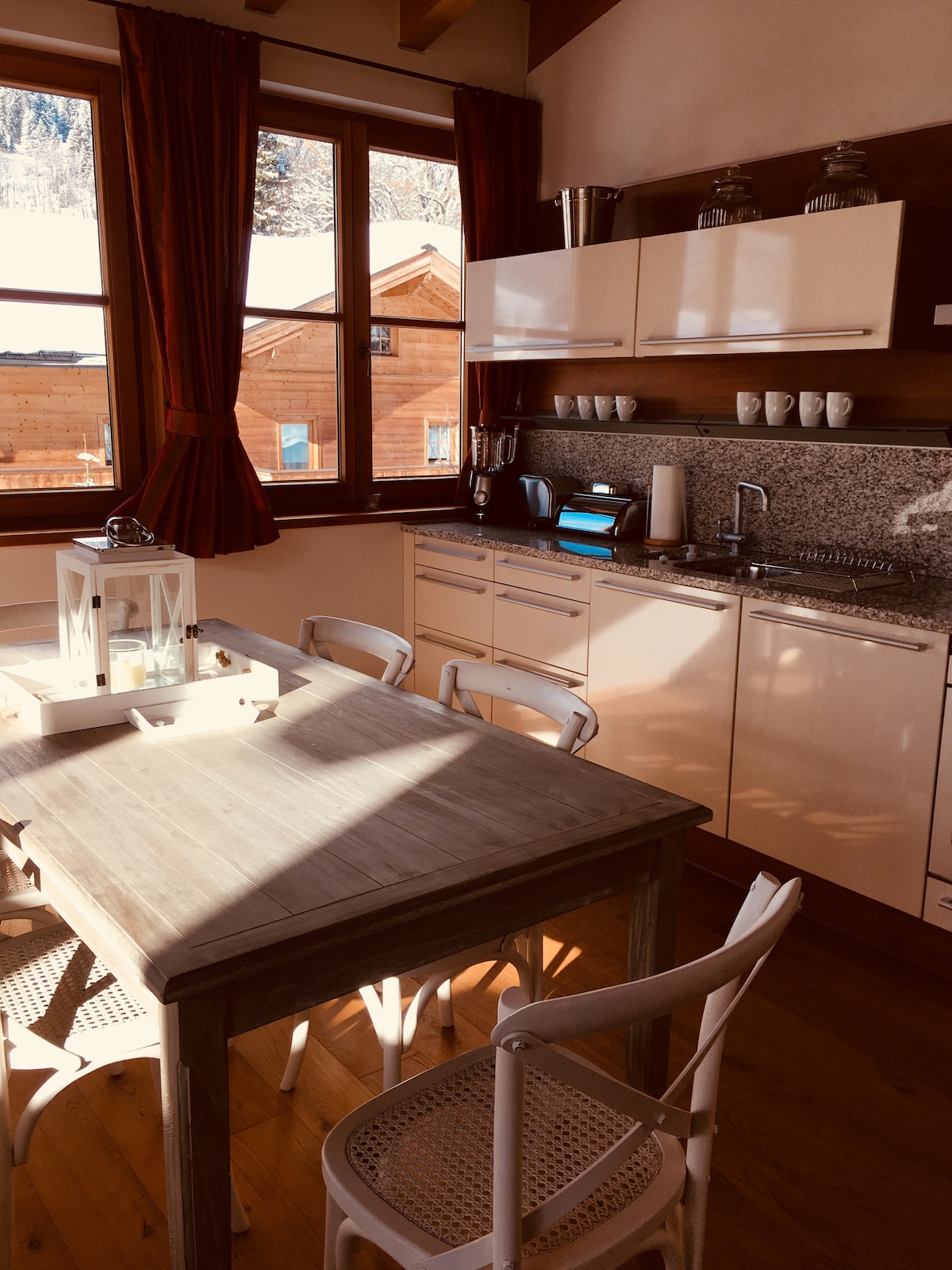 The home is situated in the heart of the village a short walk from the ski shop, nursery ski slope and all the restaurants. The main ski slope is only a five minute walk from the front door. There is a large open plan living space kitchen dinner living room. The home was designed by combining two apartments into one creating a 220 sq m of lateral space. Perfect for two to three families to she a wonderful summer or winter experience in the mountains.