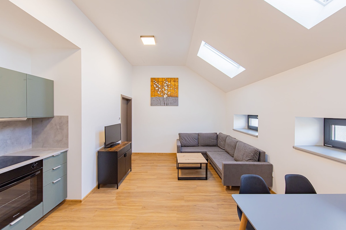 Apartamentul confortabil, cu o priveliște minunată, la câțiva pași de centrul orașului. Acesta este situat strategic aproape de monumente majore, muzee, teatre, universitate, locuri de sport și cafenele. Două dormitoare spațioase cu paturi matrimoniale îți vor oferi intimitate și confort. Poți folosi bucătăria complet utilată și livingul mare pentru momente comune. Bucură-te de un weekend romantic sau explorează Olomouc cu prietenii.