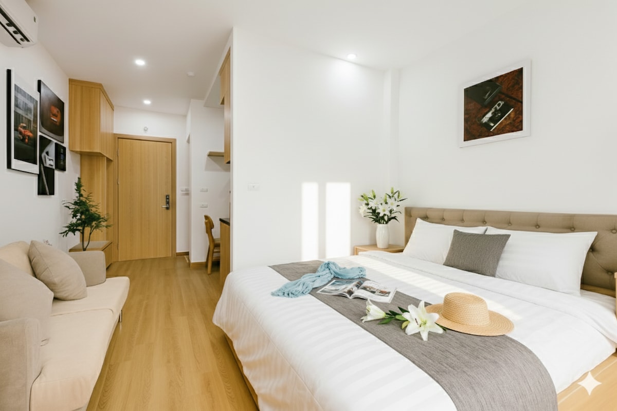 Ẩn mình trong con ngõ nhỏ yên tĩnh ngay trung tâm Tây Hồ, Kem Apartment mang đến trải nghiệm lưu trú ấm cúng và riêng tư với thiết kế studio hiện đại rộng 55m2. Từ ban công, bạn có thể ngắm nhìn khách sạn Sheraton và Intercontinental - biểu tượng sang trọng của khu vực. Không gian thoáng đãng, đầy đủ tiên nghi, lý tưởng cho các cặp đôi hoặc du khách muốn khám phá Hà Nội một cách tinh tế và trọn vẹn.