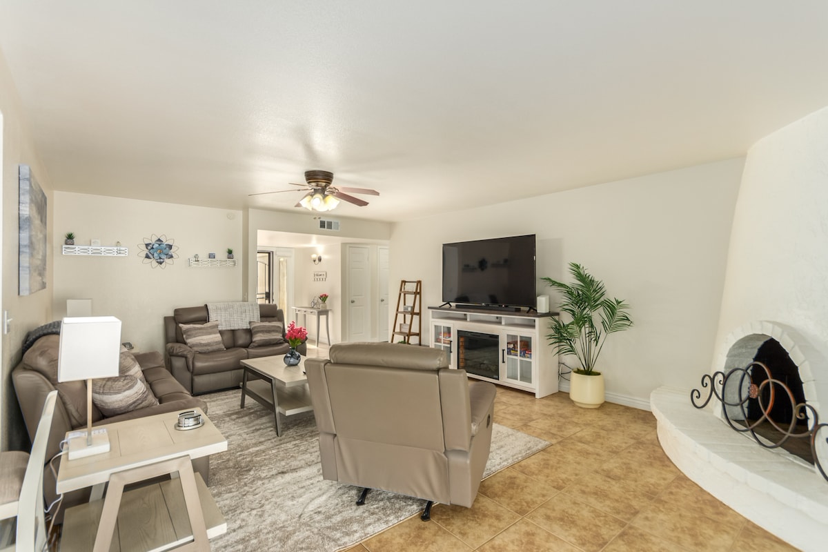Bine ai venit în escapada ta perfectă în Mesa! Această casă spațioasă găzduiește confortabil grupul tău cu 4 paturi plus o canapea extensibilă matrimonială. Bucură-te de confortul unei locații centrale: • Facilitățile de antrenament Cubs & A's Spring – sub 3 mile • Centrul Vechi Scottsdale – la mai puțin de 10 mile • Aeroportul Internațional Phoenix Sky Harbor – la doar 10 minute Relaxează-te și relaxează-te la piscina privată a locuinței (deservită profesional săptămânal; neîncălzită) sau ieși să explorezi toate atracțiile din apropiere.