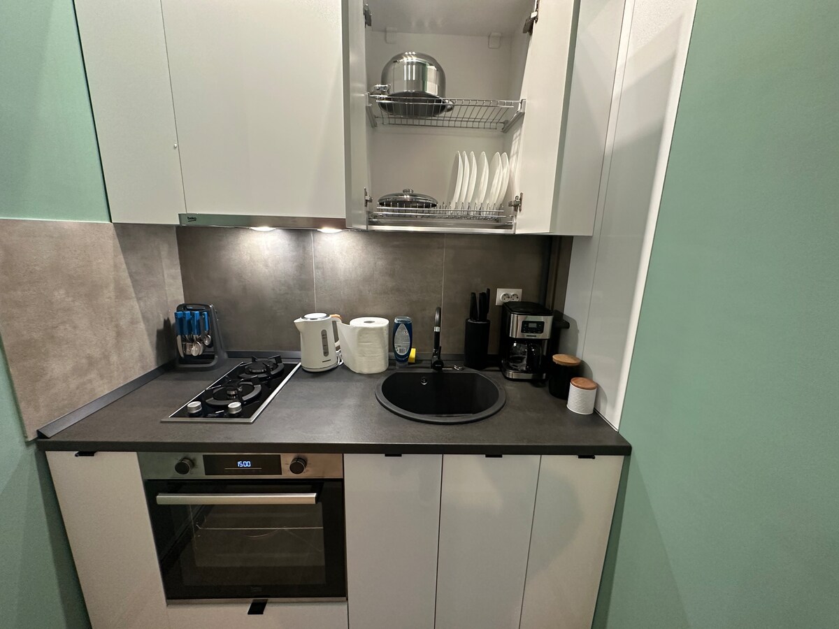 Bine ai venit în evadarea ta perfectă! Acest apartament fermecător cu o cameră este conceput pentru a oferi un amestec de confort și stil, ideal pentru călătorii singuri sau cuplurile care caută un refugiu confortabil. Spațiul este decorat cu mobilier de bun gust și iluminare modernă, creând o ambianță caldă și primitoare. Situat într-un cartier nou-nouț, vei fi aproape de un centru comercial local, de cafenelele la modă și de mijloacele de transport în comun.
