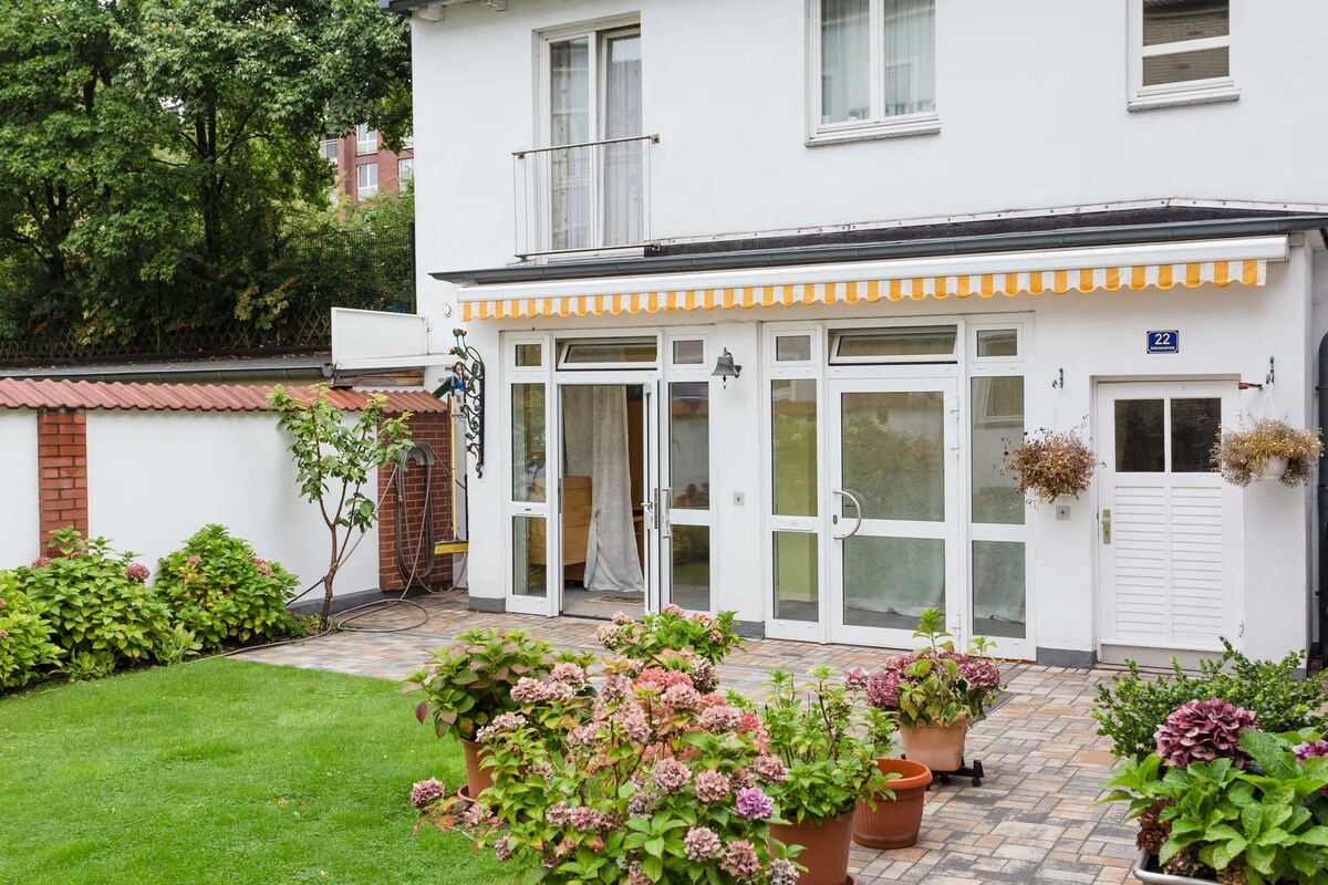 Unsere charmante Einliegerwohnung liegt in einer ruhigen Sackgasse eines Wohngebiets, nahe dem Alstertal, das zu schönen Spaziergängen einlädt und dem AEZ - Hamburgs schönstes Einaufzentrum. Der Flughafen ist zehn Min. mit dem Auto entfernt, und die Hamburger Innenstadt mit den öffentlichen Verkehrsmitteln leicht und innerhalb von ca. 30 Min. zu erreichen. Die voll ausgestattete Unterkunft verfügt über einen eigenen Garten mit Terasse, der Privatsphäre garatiert, und ist sehr kinderfreundlich.