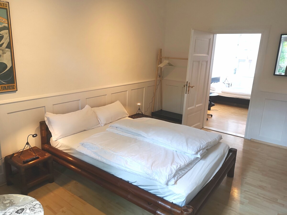 Helle 3 Zimmer Altbauwohnung 62 m² im Hochparterre. Neu renoviert mit hohen Decken in bester Innenstadt-Lage. Ruhige Seitenstraße am Wilhelmsplatz, ein Schlafzimmer mit Blick in den Garten. Kleine aber funktionelle Küche. Duschbad und WC mit Fenster. 2 Schlafzimmer mit Doppelbetten 140x200cm und 160x200 cm mit neuen Matratzen, Wohnzimmer mit Schlafcouch 160x200 cm. 2 große TV (davon einer mit freiem Netflix-Zugang) Waschmaschine undTrockner im Haus
