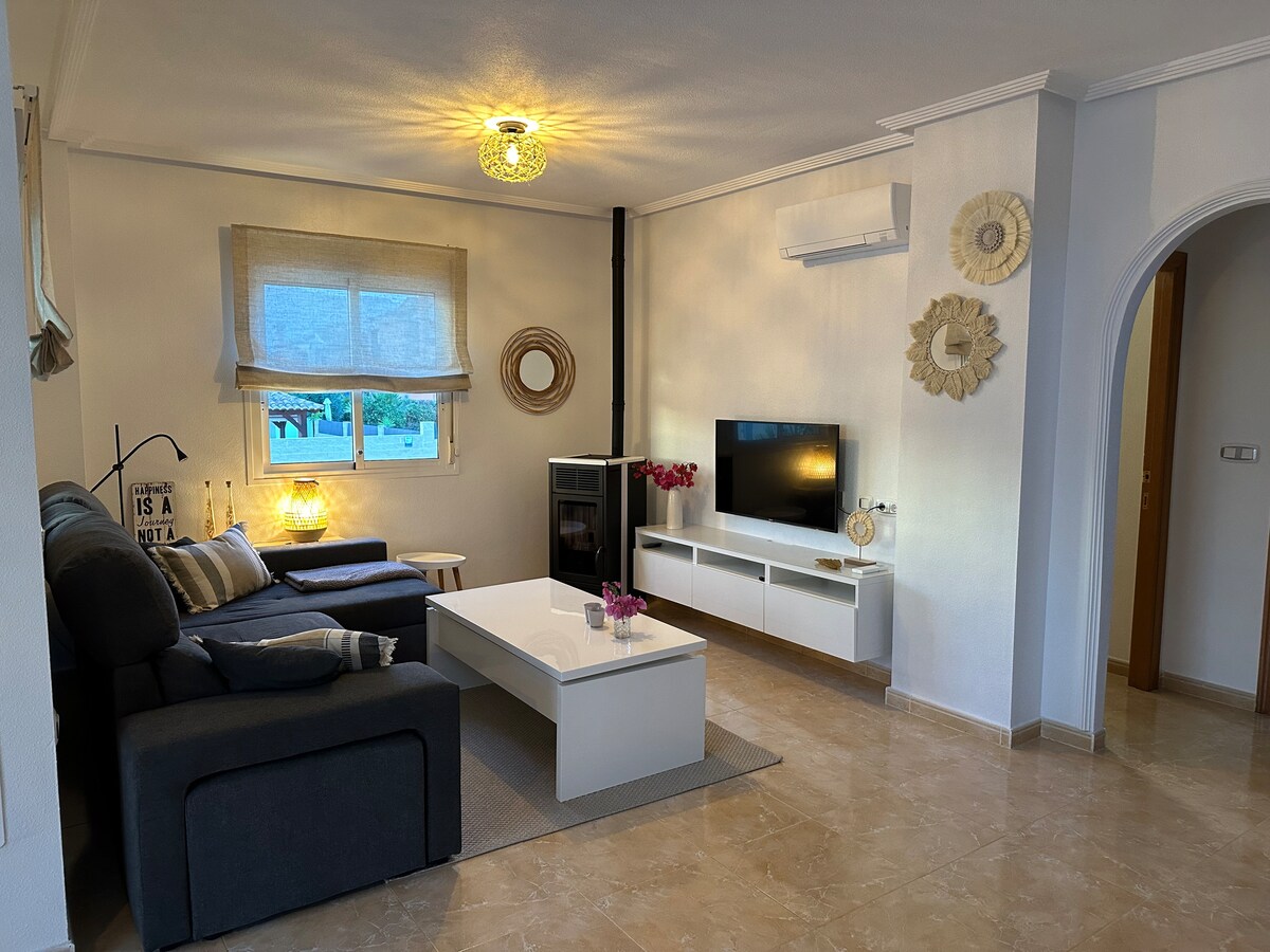 Casă din lemn fermecătoare, cu toate dotările. Bucătărie bună, două băi, living, sufragerie, sufragerie, sufragerie și patru camere complet echipate. Aer condiționat și căldură în toate camerele. În aer liber special pregătit pentru o vacanță bună. Piscină, grătar, zonă de relaxare, ananas... Întreaga familie se poate bucura de natură confortabil. La aproximativ 20 de minute de aeroport și la 15 minute de plajele din Santa Pola.