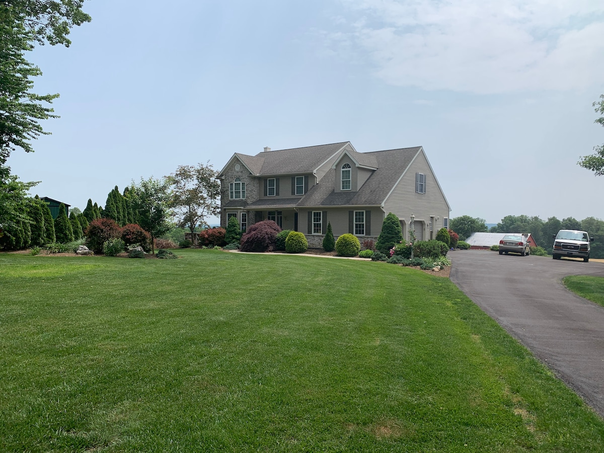 Come enjoy The View overlooking Amish farmland and feed the farm animals in the back yard. Watch spectacular sunrises from the deck or overlook the farmers field from the hot tub. Feel the smooth texture and beauty of solid handmade furniture. We have room for the whole family or even several families. Relax knowing your host lives on the adjoining property and is wanting your stay to be all you hoped for and more!