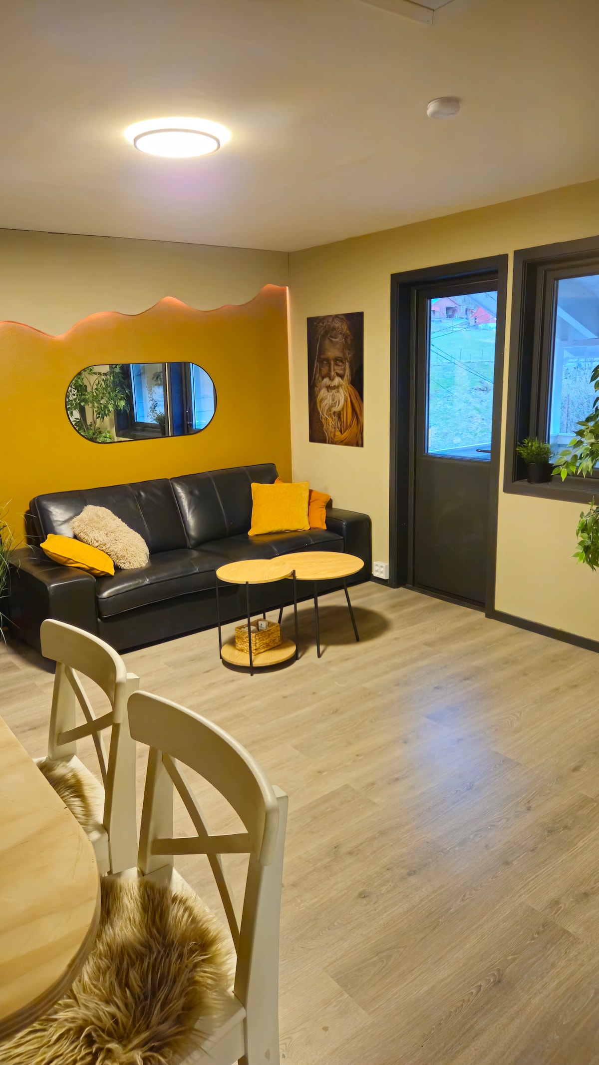 Bucură-te de priveliștile de pe verandă într-un cadru liniștit. Situat aproape de natură, chiar lângă centrul orașului. Parcare gratuită. Un dormitor separat + dormit în livingul spațios. Centrul de autobuze: aproximativ 5-10 minute de mers pe jos pe versantul muntelui + 11 minute cu autobuzul. Aproximativ 15 minute de mers pe jos până la plajă, 10 minute până la sporturile Frøya. Casă de activități gratuite: Fysak. Traseul lacului este la 50 de metri distanță, cu instalații de parc, seră, grătare, vârfuri montane și trasee de drumeții. Explorează centrul orașului Bergen sau găsește liniștea într-o călătorie de afaceri sau într-o călătorie cu familia.