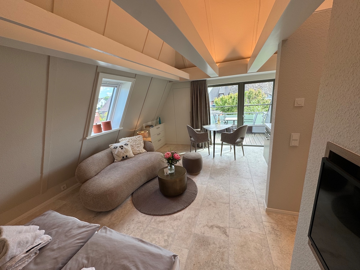 Apartamentul loft este dotat cu tot ce ai nevoie pentru o vacanță relaxantă pe Sylt. Datorită crestei deschise a acoperișului, camera are o înălțime excepțională și un efect al camerei. Reîncarcă-ți bateriile într-un pat de lux cu arcuri. Acestea au o cameră de duș cu toaletă și bucătărie complet utilată. Prosoape și lenjerie de pat incluse. Radio, cablu TV și Wi-Fi sunt, de asemenea, disponibile. Relaxează-te în propria loggie scăldată de soare, cu orientare completă spre sud.
