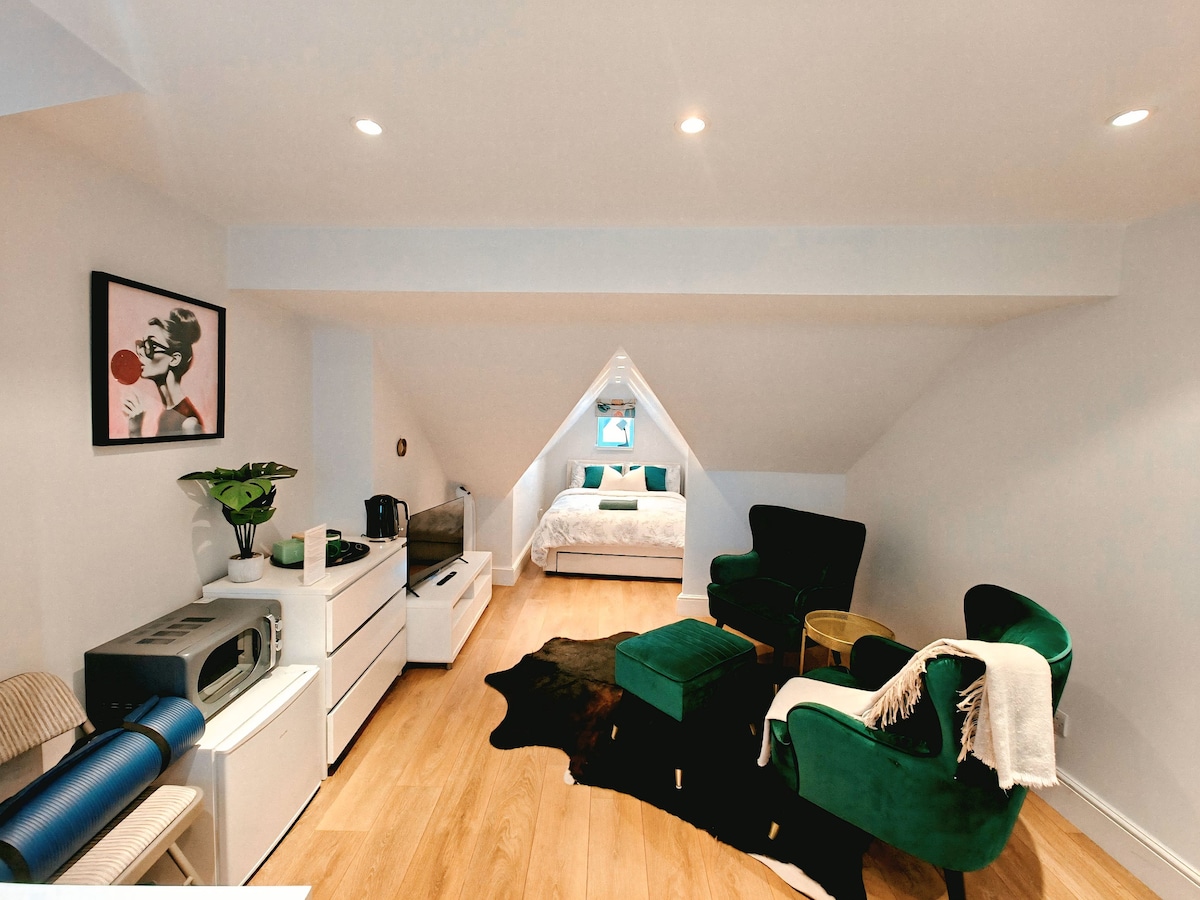 Bine ai venit în spațiul tău modern din Londra! Acest studio nou-nouț combină confortul și stilul urban în inima Ealing. Designul său curat și funcțional îl face ideal pentru călătorii singuri, cupluri sau grupuri mici, cu spațiu pentru până la trei oaspeți datorită unei canapele extensibile confortabile. Perfect pentru relaxare după o zi de explorare a orașului, pentru a lucra de la distanță sau pentru a te bucura de o escapadă relaxată, cu tot ce ai nevoie la îndemână.