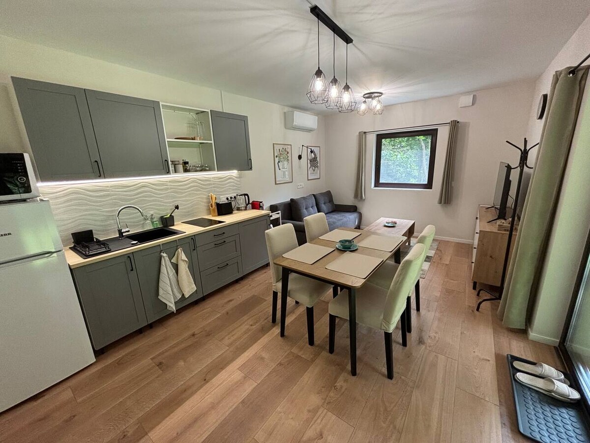 Pe o stradă liniștită, pe o stradă liniștită, la doar 300 de metri de intrarea în Valea Szalajka, apartamentul curat îi așteaptă pe cei care doresc să se oprească. Spațiul interior minimalist modern, complet echipat, se deschide către o grădină mare plină de copaci, cu cadă, grătar și spațiu de agrement. Bicicletele și liniile tùraù încep pentru cei care au nevoie de relaxare activă.