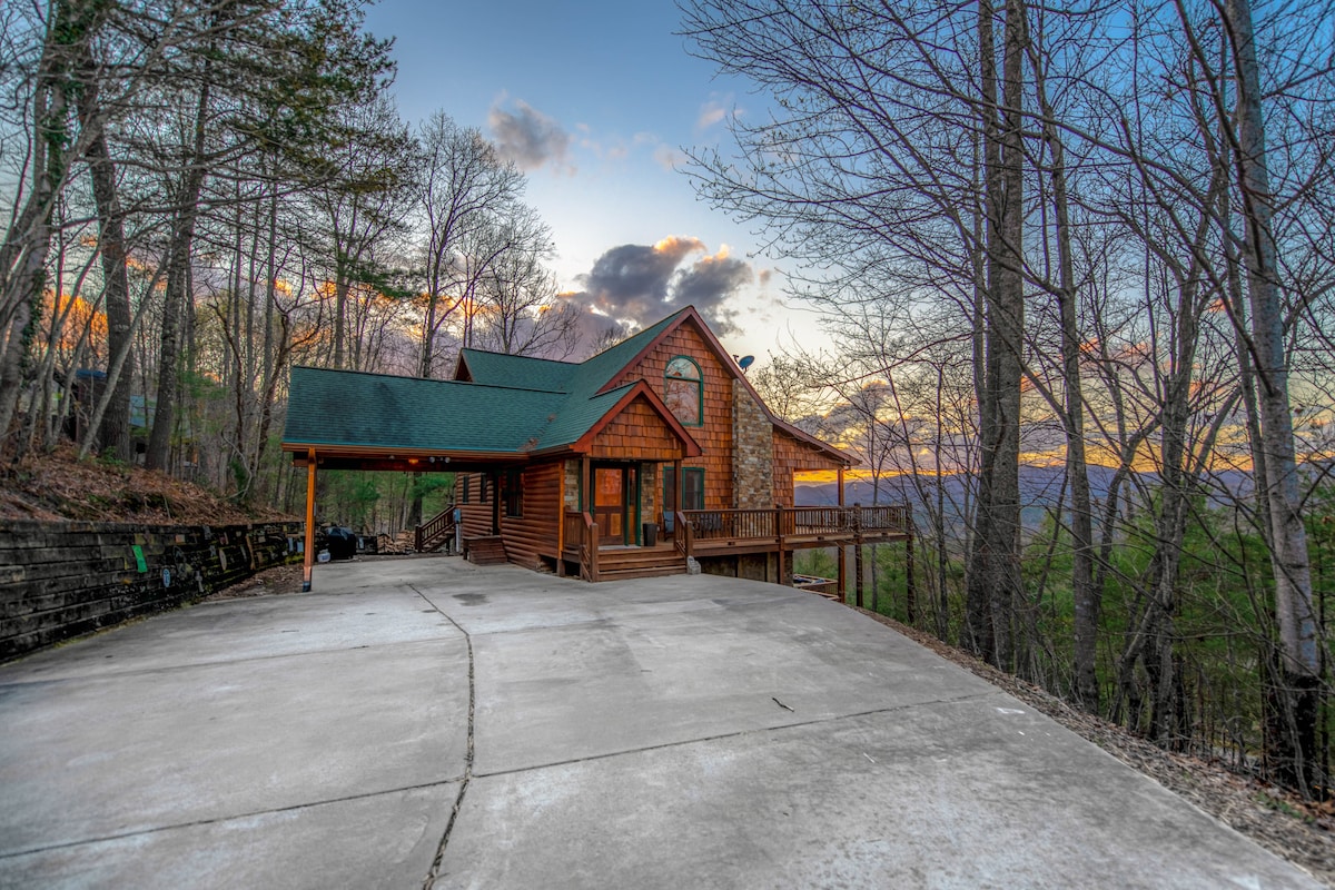 Cabană personalizată din bușteni cu vedere la munte! Situat în apropiere de pitorescul Murphy NC. Plan deschis, tavane boltite, cameră mare cu șemineu din piatră, podele din lemn de esență tare și un perete de ferestre pentru priveliște. Bucătăria are blaturi de granit și un bar pentru micul dejun. Mansardă confortabilă cu apartament principal spațios, baie privată din granit și spațiu de birou cu vedere. Nivelul principal are un dormitor pentru oaspeți și o baie completă. Există 2 punți mari acoperite pentru a vă bucura de priveliști, o curte adâncă și gropi de foc din lemn și gaz.