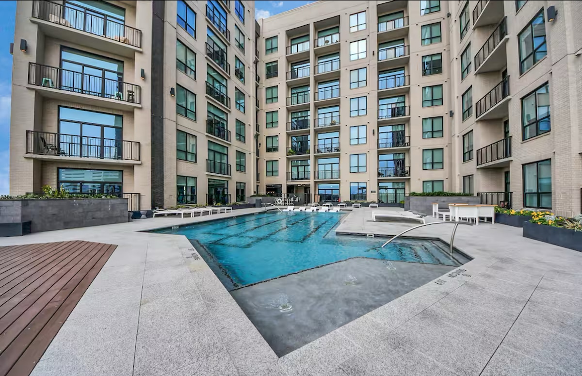 Odihnește-te liniștit în acest apartament luxos cu 1 dormitor și 1 baie, cu terasă la piscină, situat la Domeniul din complexul de apartamente Kirby. Dacă sunteți în căutarea de a rezerva aproape de stadionul NRG la câțiva pași de RODEO, acesta este locul perfect! Suntem la 15 minute de mers pe jos de parcul NRG și la 7 minute de mers cu mașina de Centrul Medical Texas. Ne aflăm în apropiere de multe destinații suplimentare îndrăgite din Houston, inclusiv cartierul muzeelor, grădina zoologică din Houston și o multitudine de opțiuni de luat masa.