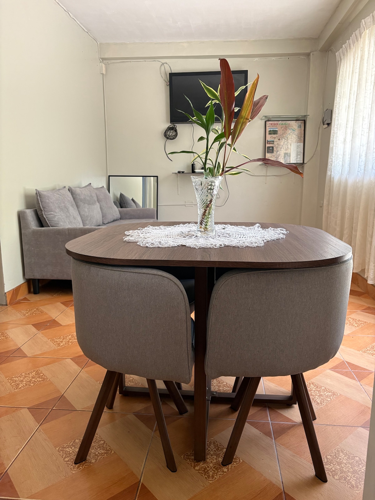 Bucură-te de un sejur elegant și relaxant pentru a te bucura de o familie. Huanuco te așteaptă cu această frumoasă Cazare care are o terasă, inclusiv unde vei avea un spațiu mai confortabil și mai plăcut. Așteptăm cu nerăbdare să te vedem... Cazarea este situată la 5 minute de centrul orașului. Acest Minidepartamento se află la etajul 6 al unei clădiri noi. Nu are lift Are o terasă frumoasă cu fotolii grase sintetice și lumini de garaj.