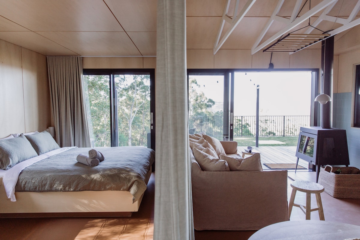 Perched high in the lush, leafy hills of the Sunshine Coast Hinterland, Bonithon Mountain View Cabin is the perfect place for you to relax and unwind. Located just 5-minute drive from Maleny, our wood cabin studio offers a luxurious getaway with all of the finest touches. Bonithon offers sprawling views of the Glasshouse Mountains all the way up to the Brisbane skyline and the waters of the Moreton Bay region. You can enjoy these views and more while taking in the fresh mountain air & birdsong.