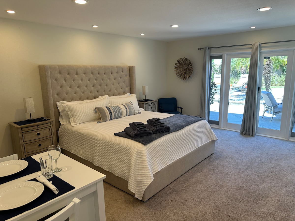 Suită pentru oaspeți cu intrare privată, dormitor matrimonial cu pat matrimonial, duș mare, smart TV, internet de mare viteză și chicinetă (cuptor cu microunde, veselă, pahar, vin, cafea, cafetieră) prosoape de plajă, șezlonguri, mașină de spălat/uscător. Ușă franțuzească în curtea privată. Locație convenabilă, în apropiere de tot. Distanță de mers pe jos până la plajă, centrul orașului, Main St, Pier, Pacific City Shopping Center. Acesta este locul perfect pentru o vacanță memorabilă pe plajă. Relaxează-te în această cazare liniștită.