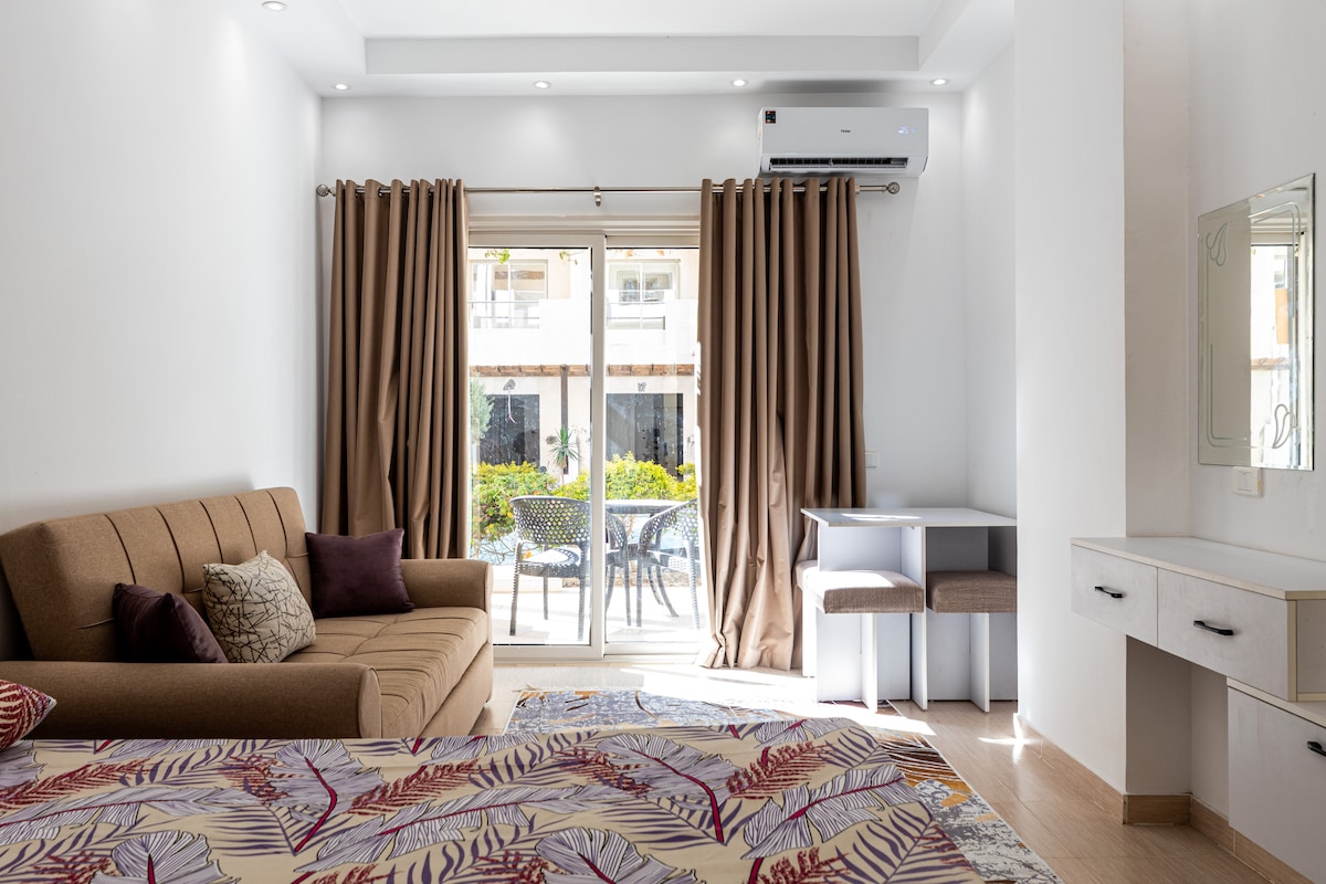 Apartament modern, potrivit pentru familii, în Scandic Resort Hurghada, cu vedere uimitoare la mare, piscină și grădină. Are un dormitor confortabil, living cu canapea extensibilă, bucătărie complet utilată și balcon privat. Bucură-te de dotări ale complexului, cum ar fi piscina și grădinile, plus o sală de gimnastică (taxă suplimentară). La doar câțiva pași de plajă și de recifele de corali vibrante — perfecte pentru snorkeling. Ideal pentru familii, cupluri sau lucrători de la distanță care caută o escapadă elegantă și relaxantă în Marea Roșie.