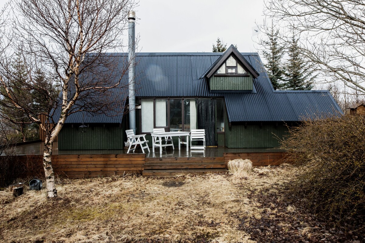 Cabana noastră se află pe un teren frumos cultivat în copac, în mediul rural al Islandei, dar la numai 45 de minute de mers cu mașina de Reykjavik. Este foarte important să faci excursii de o zi în toate direcțiile. Vizitează gheizerele, multe cascade, fiorduri, ghețari, vulcaones și multe altele.