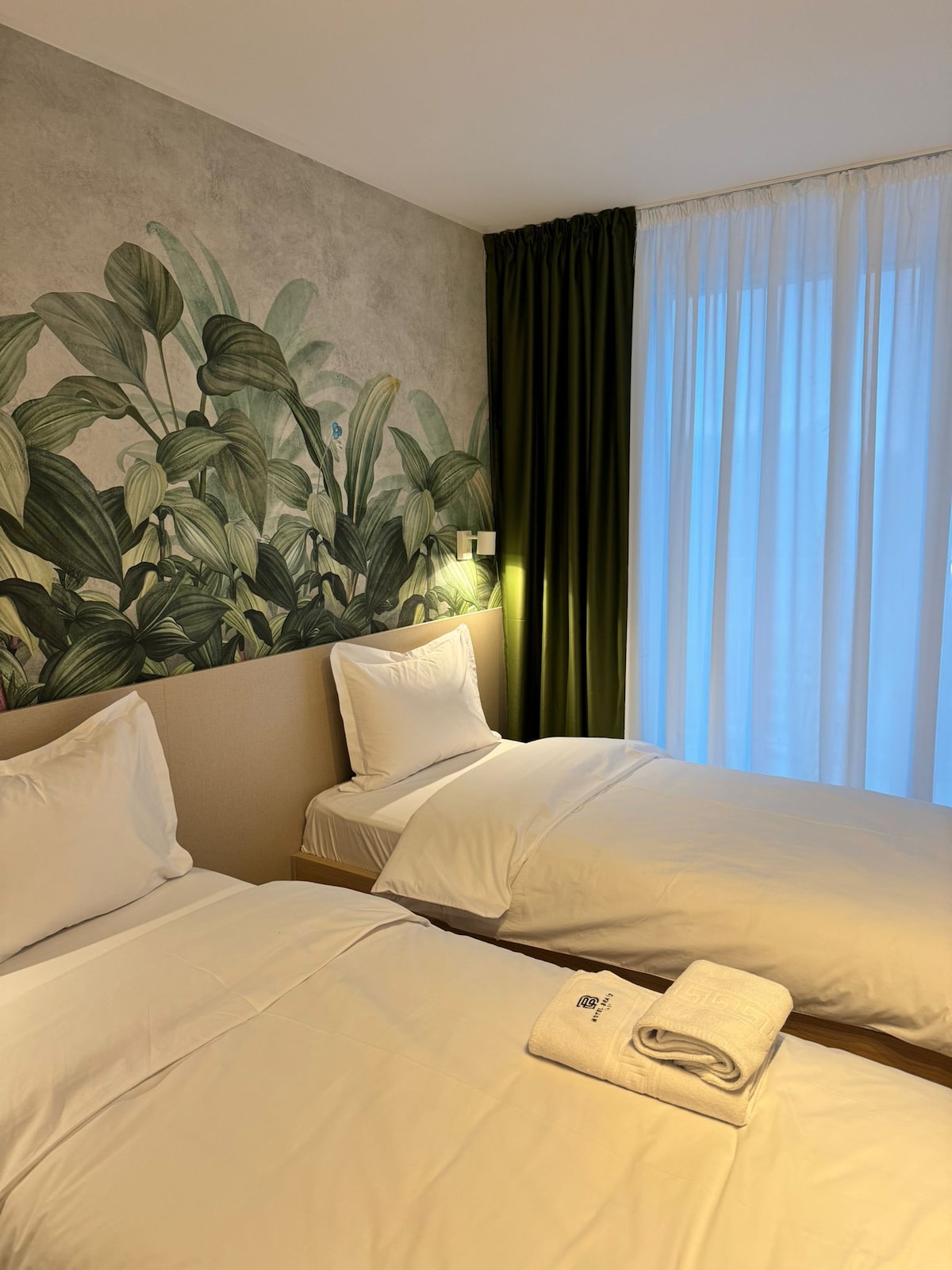 This spacious suite is perfect for families or small groups looking for both comfort and privacy. Upon entering, you'll find a hallway that leads to a private bathroom and two separate bedrooms: one with a double bed and the other with two twin beds. Each room has its own door, making this suite ideal for families with children, couples traveling together, or friends who want to share a space without sacrificing personal comfort.