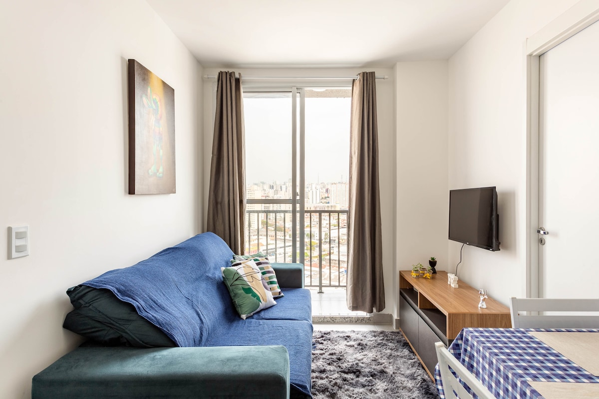 Lasă-te fermecat de studioul nostru din centrul orașului! O ședere completă și funcțională, pat matrimonial (raritate aici), lenjerie completă, kit de baie gratuit și o bucătărie bine echipată cu friteuză etc. Avem Wi-Fi, Smart TV, încuietoare electronică și check-in ușor. Dormim până la 4 persoane cu suport pentru canapea extensibilă. Poziție excelentă, la 200 m de metroul din Brás, acces facil la mai multe puncte ale SP, cum ar fi Rua 25 de Março, Feira da Madrugada, Liberdade și Av. Paulista. Rezervă acum și bucură-te!