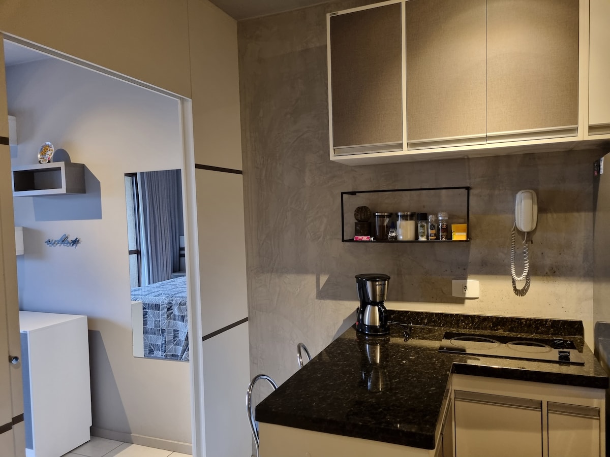 Studio confortabil și modern! Lenjerie de pat și baie de hotel! Este esențial să trimiți numele complet și cpf. Nu există niciun loc liber inclus în tariful zilnic. Garaj subteran externalizat. Nu permitem vizitatori, ci doar oaspeți înregistrați anterior. Nu acceptăm rezervări pentru terți, unul dintre oaspeți trebuie să fie solicitantul rezervării.