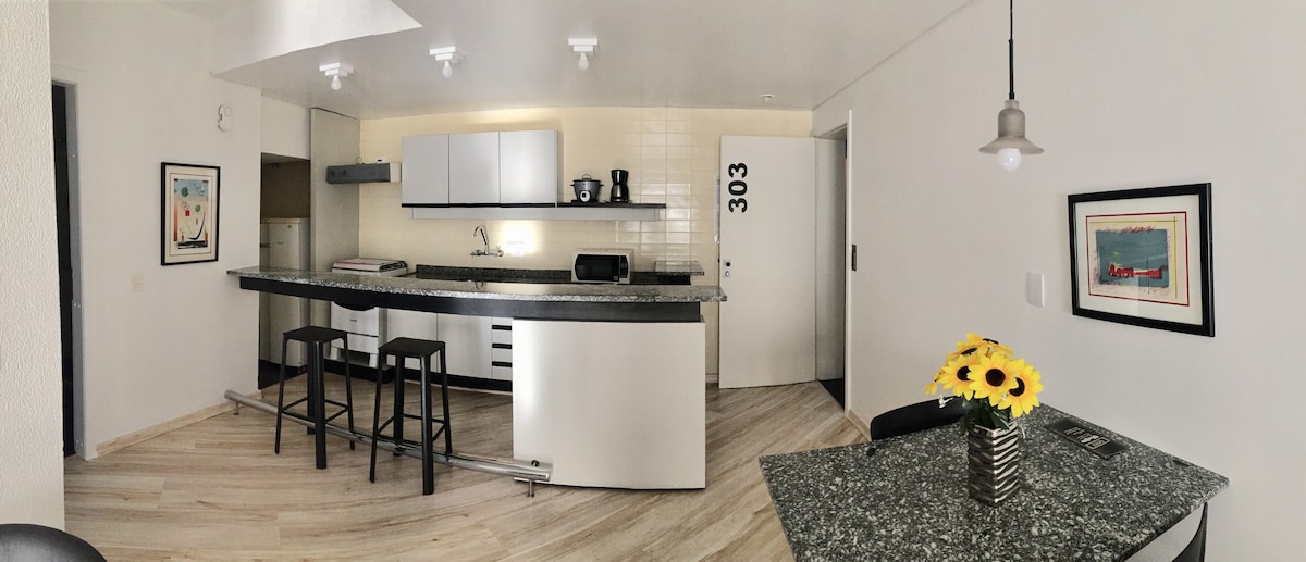 Bine AI venit. Acest studio nou deschis a fost pregătit cu drag pentru a te face să te simți ca acasă în Curitiba. Tonurile neutre, tâmplăria funcțională și iluminatul moale fac atmosfera ușoară și liniștită. Aici te poți odihni, lucra în liniște și te poți bucura de oraș cu simț practic. Reședința MUV se află într-o zonă centrală, cu acces facil la spitale, universități, restaurante și atracții locale. Această garsonieră nu are garaj, dar există opțiunea de parcare cu plată în clădire.