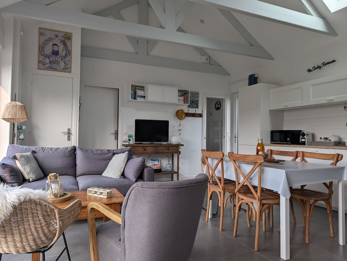 Maison de 2021, classée meublé de tourisme 3 étoiles, située au centre de l'île Tudy, à 150m de la plage et du port. A proximité de Pont l'abbé, Loctudy et Bénodet, vous pourrez profiter de belles promenades à pied, à vélo et en bateau! Activités nautiques à proximité pour petits et grands: surf, paddle... Vasière pour la pêche à pied à 50m. Au calme, c'est le cadre idéal pour des vacances dépaysantes, proche de toutes les commodités (Restaurants, épicerie...) à 5min à pied.