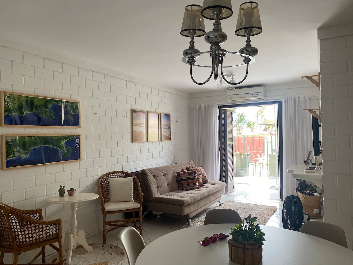 Situat în Praia do Curral, cu cea mai bună infrastructură de pe insulă, la 150 de metri de mare, un apartament complet, cu 1 dormitor cu pat dublu și aer condiționat separat, un living cu pat dublu, 2 paturi de o persoană și un televizor de 42 inch, o bucătărie completă, o baie și o toaletă. 1 loc de parcare. Ducha direct din Cachoeira, un loc liniștit și zgomotos, vino să te bucuri de un loc paradisiac. Alugo, de asemenea, lunar. Etajul superior al casei nu face parte din închiriere, apartamentul este la parter