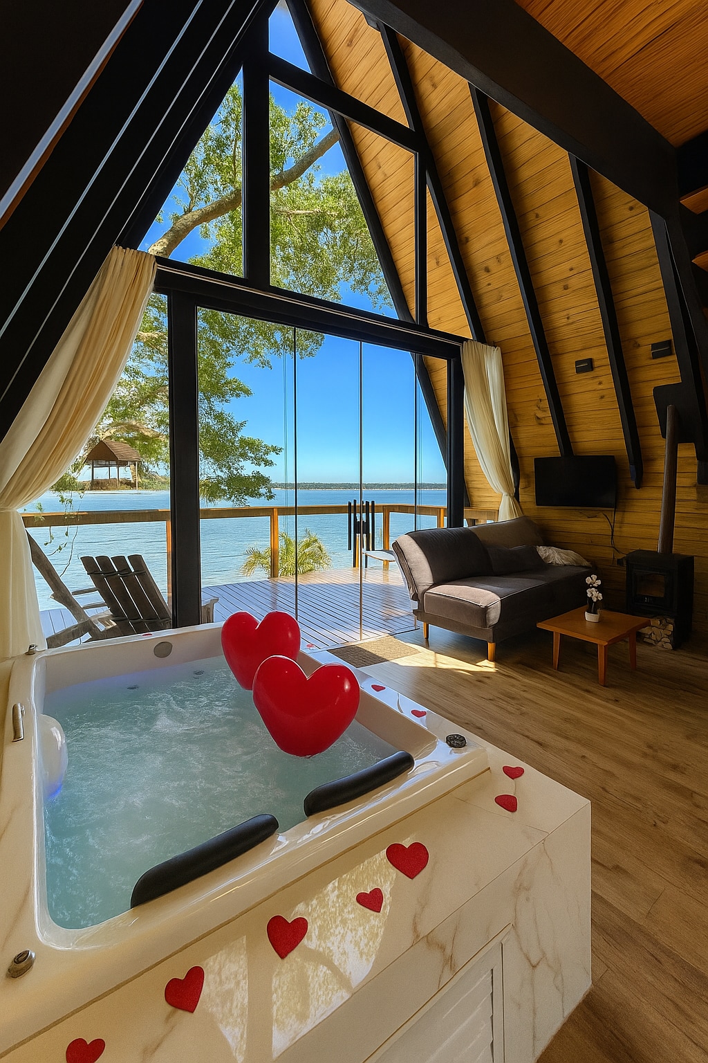 Pregătește-te pentru o experiență uimitoare ✨ Cabană romantică în lagună, cu vedere panoramică spectaculoasă, cadă cu hidromasaj, piscină și încălzitor, reunind stilul, sofisticarea și confortul, perfect pentru ca cuplurile să se bucure de momente memorabile ❤️ Poziție privilegiată, cu acces 100% pavat, chiar pe lagună, la doar 30 de minute de plajele din Imbituba, la câțiva metri de centru și lângă cele mai bune restaurante din regiune.