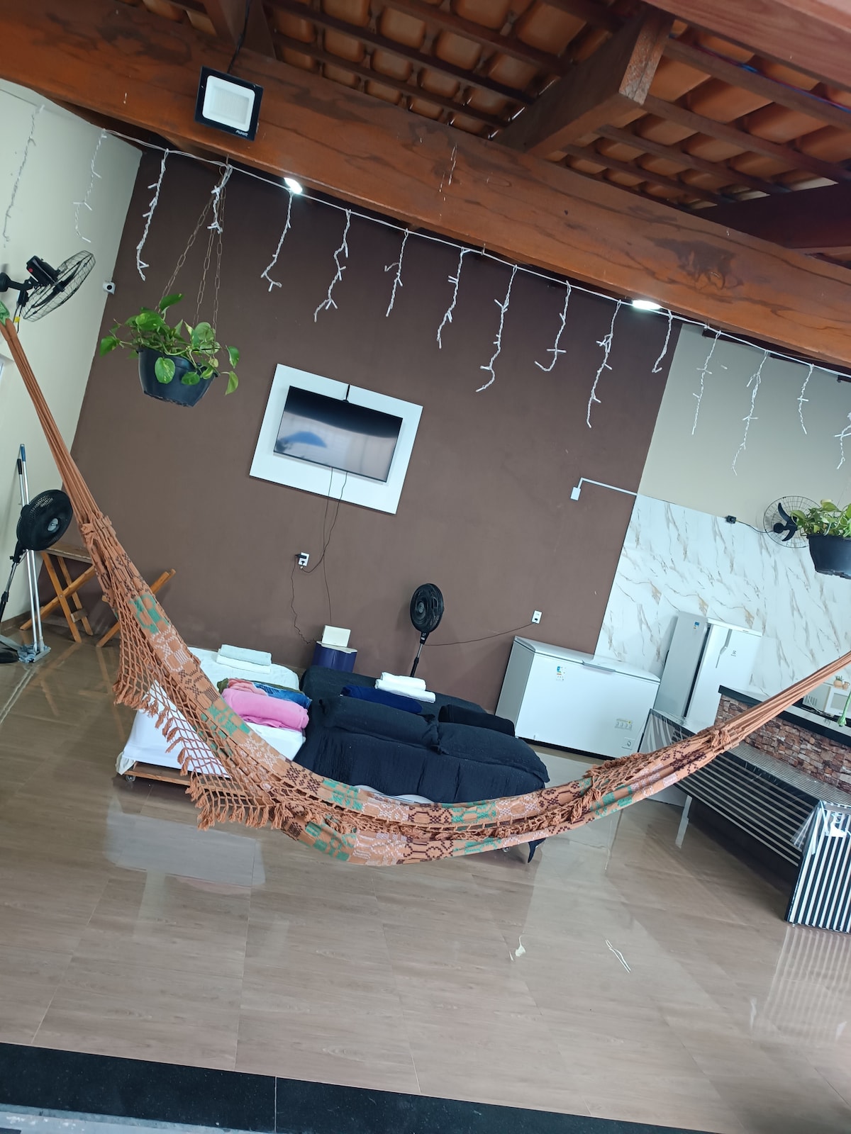 Deși nu avem camere disponibile, avem două paturi, unul dublu și unul de o persoană, precum și două hamace, dacă este necesar. Trăiește momente de neuitat în acest loc unic și ideal pentru familii. Locație rustică, bine ventilată și arată ca o zonă de evenimente. Va fi o experiență de neuitat. Piscină mare cu jacuzzi și cascadă cu LED-uri. Ideal pentru odihnă și pentru a te bucura în continuare de multe lucruri, având acel grătar.