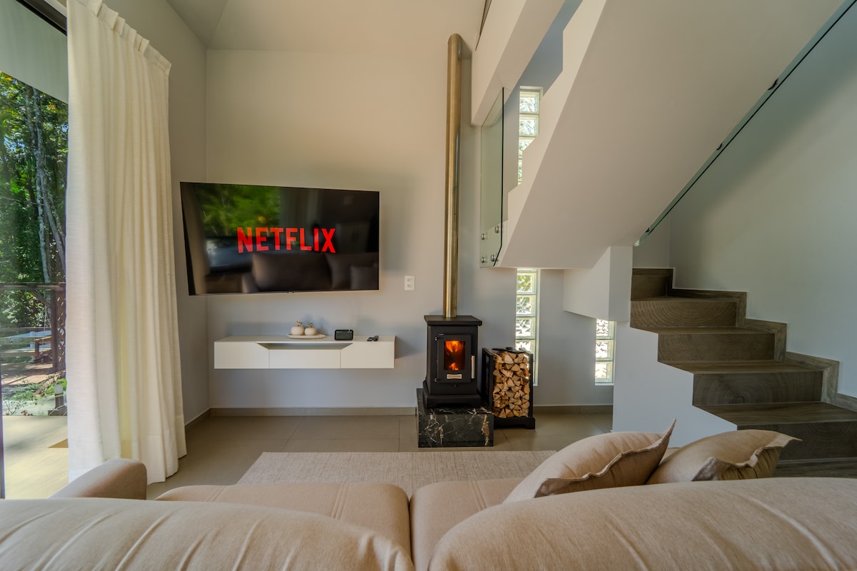 Relaxează-te în acest spațiu liniștit și elegant. O cabană în mijlocul naturii, cu vedere uimitoare la munte, cu mult confort la intimitate și lux. Un loc perfect pentru cuplurile care caută o escapadă caldă și romantică. Conținând o cadă cu hidromasaj pentru două persoane și o vedere cu munții. Bucătărie completă echipată cu aragaz, cuptor cu microunde, minibar, oală fondue. Cameră cu pat matrimonial cu lenjerie de pat de înaltă calitate. @chaleriverland