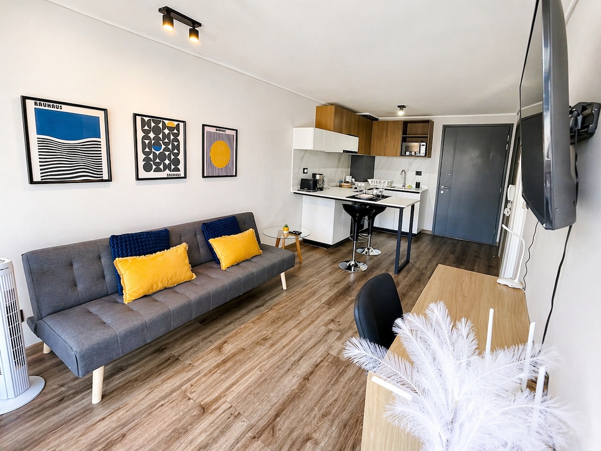 Moderno y acogedor departamento con aire acondicionado en el corazón de Santiago. A pasos del metro y del Centro Histórico, rodeado de museos, mercados y restaurantes. Cama king, cocina equipada, balcón y wifi rápido, ideal para viajes o estadías largas. Edificio seguro con conserje 24/7. Atención personalizada, check-in flexible y recomendaciones locales para que disfrutes la ciudad como un residente, con comodidad y tranquilidad.