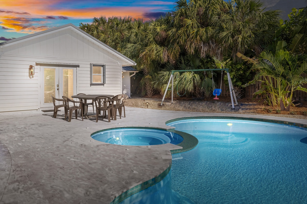 „Bungalow din lemn de santal” - Piscină încălzită și cadă cu hidromasaj - La est de A1A, la mai puțin de 1 minut de mers pe jos de o plajă privată potrivită pentru câini, pe un drum privat - 50 Amp 240V Nivel 2 Încărcător EV pentru Tesla /Vehicule electrice - Internet Wi-Fi rapid de 800 Mbps - Stație de lucru pentru zona de birouri - Servirea mesei în aer liber - Set de leagăn - Scaune de plajă, umbrelă, plăci Boogie - Chitară și pian - Grătar exterior cu gaz - Duș exterior încălzit - Groapă de foc - Sonos