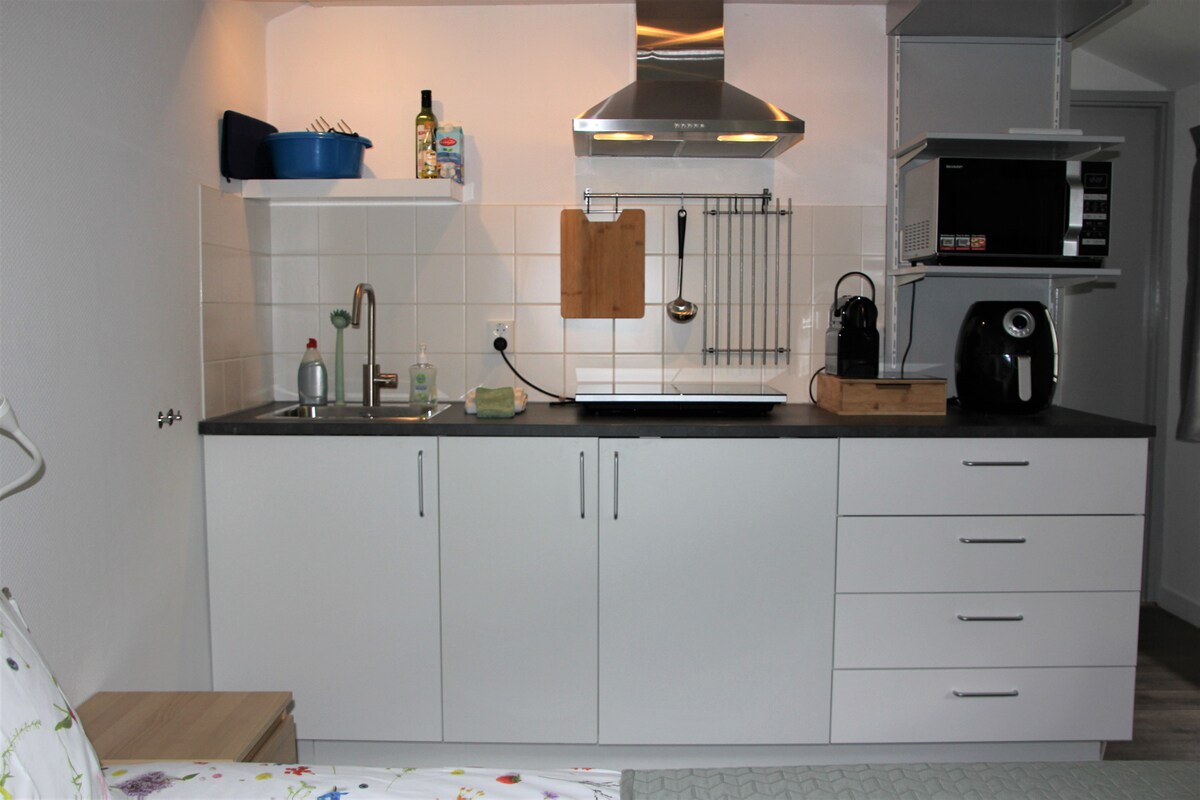 La marginea zonei construite Veenendaal, ne-am dat seama de frumosul nostru apartament cu mic dejun. Parcare GRATUITĂ pe proprietatea privată și puteți merge direct în grădina „privată” până la intrare. Living foarte mobilat cu gust și luxos, cu bucătărie deschisă; baie cu duș spațios, chiuvetă și toaletă; dormitor cu somieră dublă, dulap; intrare spațioasă cu oglindă și raft de haine. Prin ușa glisantă, mergi pe terasă cu o grădină frumos amenajată și multă intimitate!