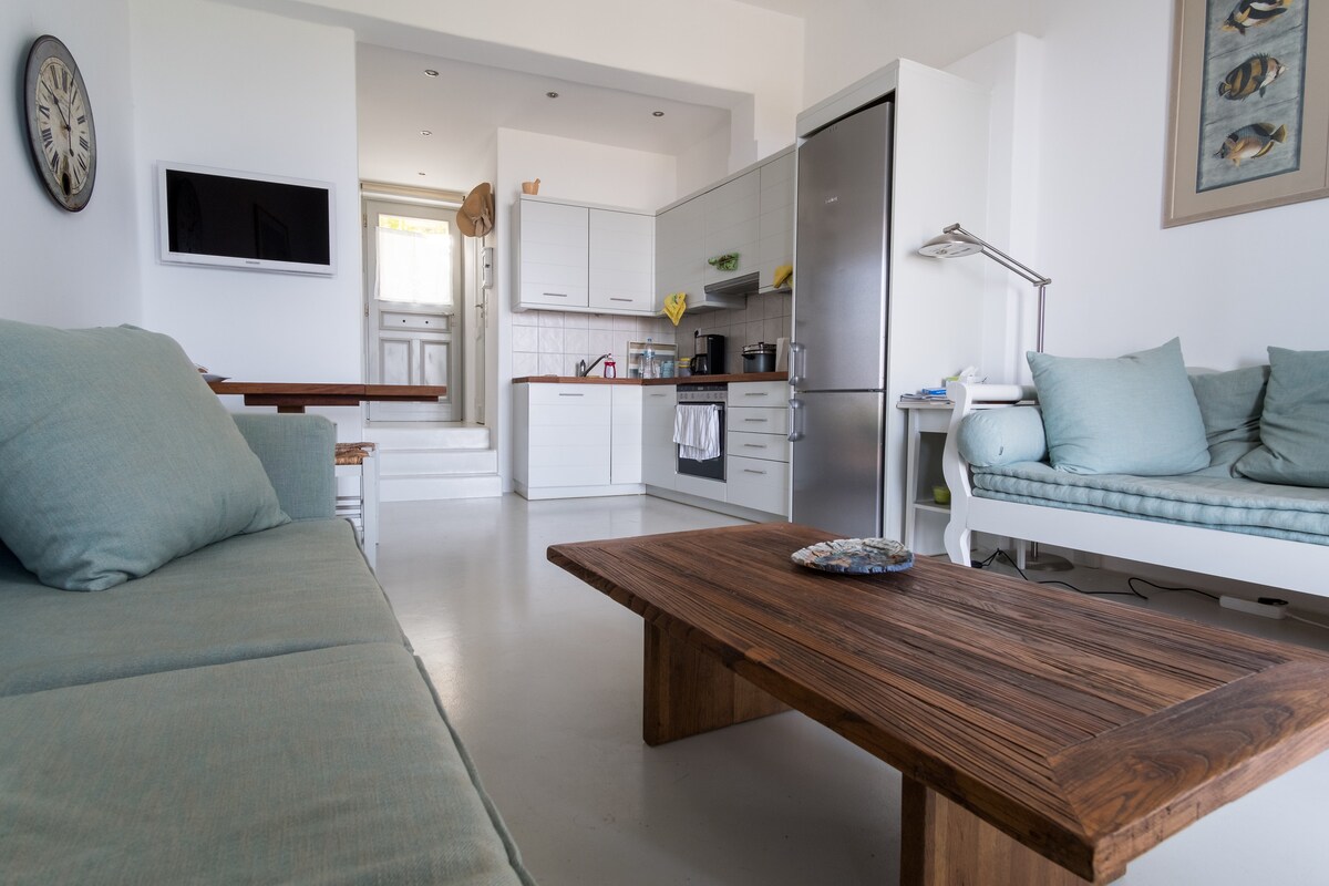 Amplasată în mijlocul stejarilor, podgoriilor, priveliștilor la mare și unei capele vechi, această presă de vin restaurată atrage iubitorii de natură și câini. Proprietarul proprietății, care este el însuși, un cultivator de viță de vie, locuiește într-o casă mai mare pe teren și este capabil și dispus să ofere „informațiile din interior” pe insulă. Satul Ioulis este la 20 de minute pe jos. Se recomandă o mașină. TE RUGĂM SĂ REȚII: există doi câini prietenoși în proprietate