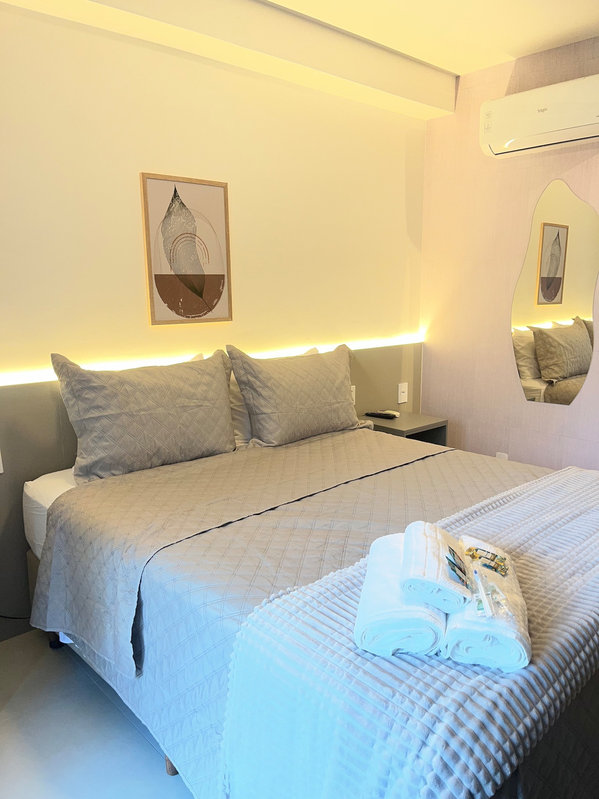 Mediu rafinat, perfect pentru cei care caută confort premium în SP. Bucătărie completă: aparat de făcut sandvișuri, cuptor cu microunde, plită, minibar, filtru de apă rece și ustensile. Decor modern, aer condiționat, Wi-Fi ultra-rapid și Smart TV. Pat dublu și canapea extensibilă dublă, iluminare confortabilă și organizare impecabilă. Locație excelentă: aproape de metrou, parcuri, restaurante, farmacii și spitale. Vino să te bucuri de São Paulo cu stil și confort! 😃